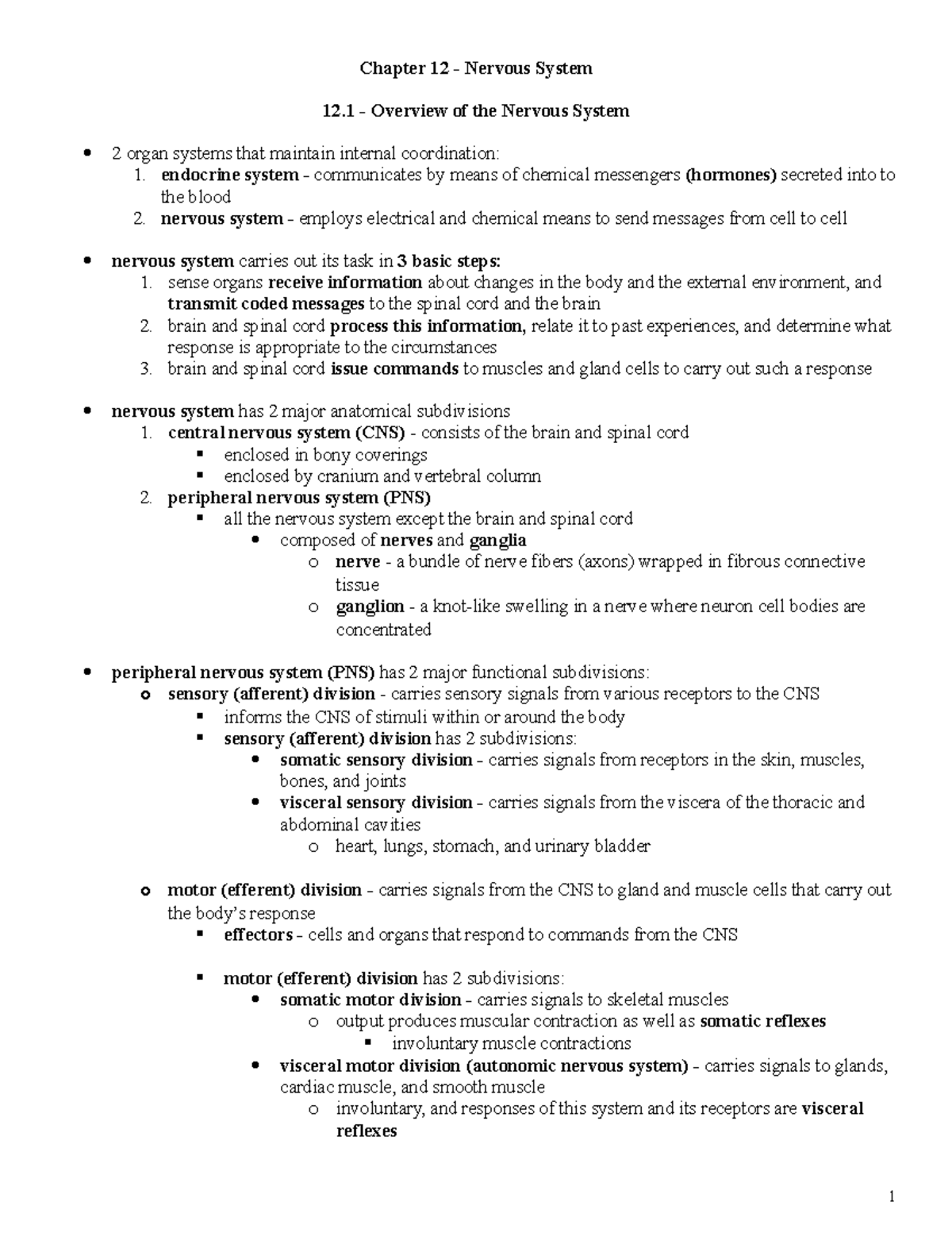 Chapter 12 Nervous System Chapter 12 Nervous System 12 Overview Of The Nervous System 2 Studocu